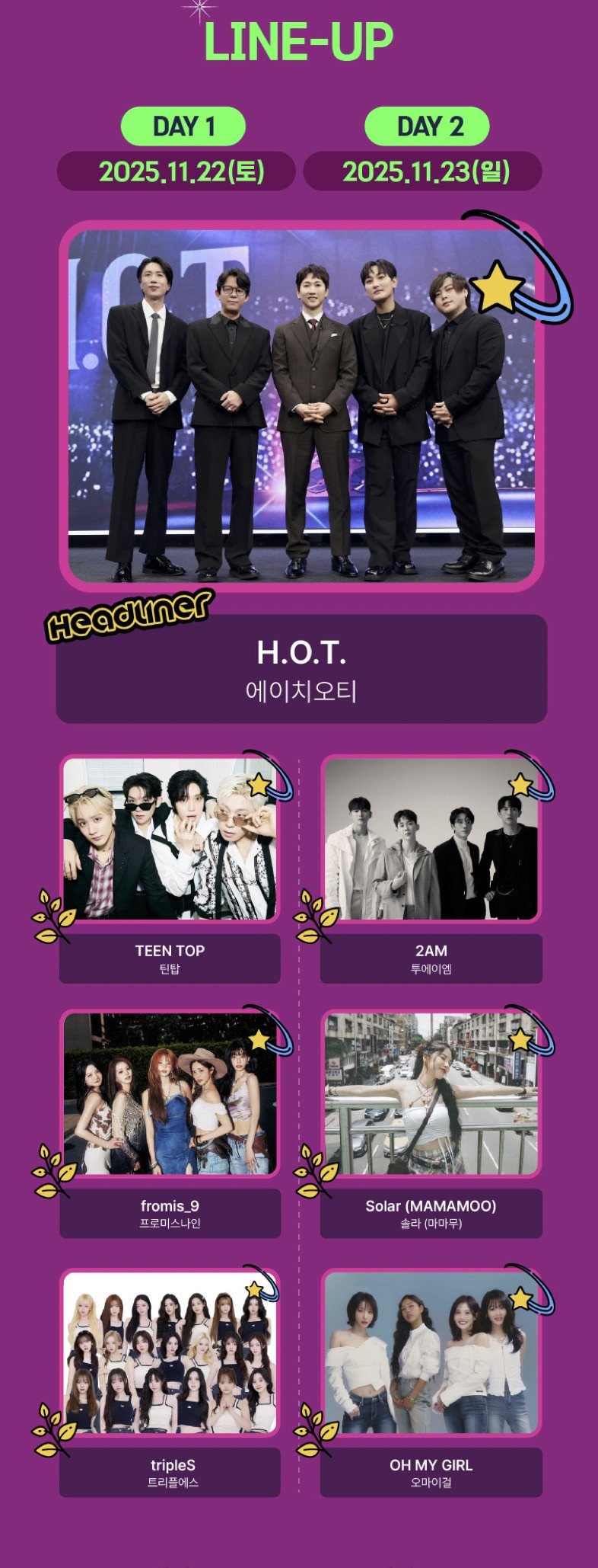 10 Ekim KST tarihinde yapılan açıklamaya göre, etkinlik artık 22-23 Kasım tarihlerinde Incheon’daki Inspire Arena’da gerçekleşecek. 1. jenerasyon idol grubu H.O.T her iki günün de başrolünü üstlenecek. 1. gün TEEN TOP, fromis_9 ve tripleS, 2. gün ise 2AM, MAMAMOO’dan Solar ve Oh My Girl sahne alacak. Festival önceden yaptığı açıklamada, başrol olan H.O.T’un yaklaşık 1 saat sürecek daha uzun bir set ile sahne alacağı vurgulanmıştı.