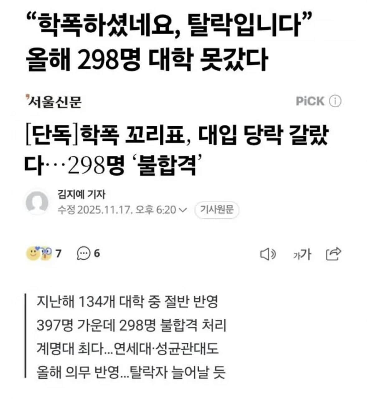 올해 학폭이력 있는 298명 대학교 불합격 처리