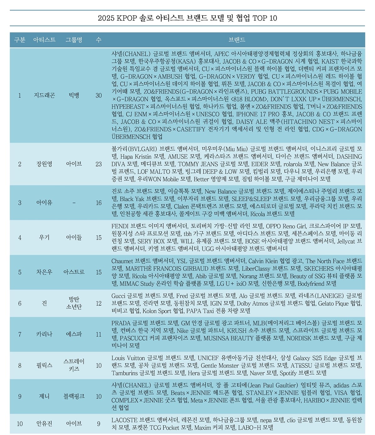 1. sıra: BIGBANG G-Dragon – 30 anlaşma