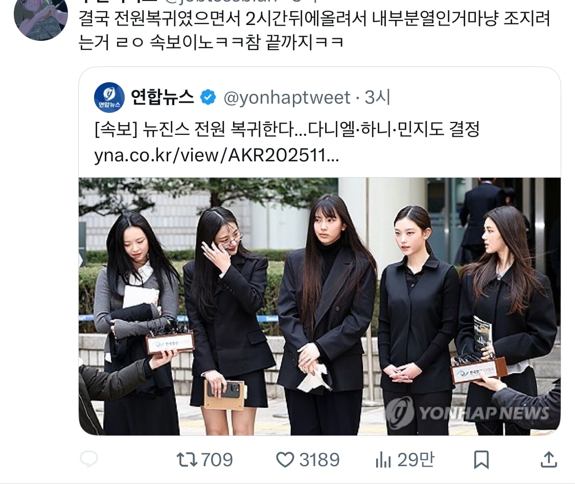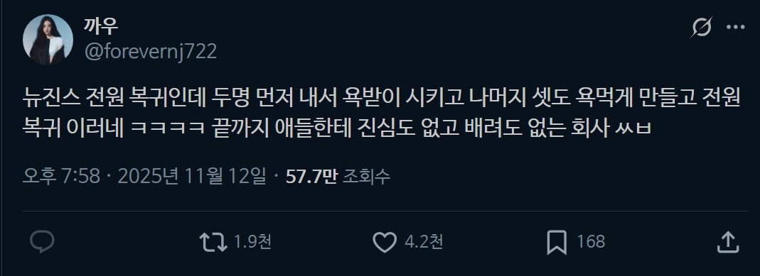 “NewJeans tam bir geri dönüş yapıyor, ama önce iki üyeyi öne atıp tepkiyi onlar alsın diye gönderiyorlar, sonra diğer üç üyeyi de eleştirilere maruz bırakıyorlar ve buna da ‘tam geri dönüş’ diyorlarㅋㅋㅋㅋ Bu şirket, sonuna kadar kızlara karşı hiç samimi veya düşünceli davranmıyor. S*ktir ya”