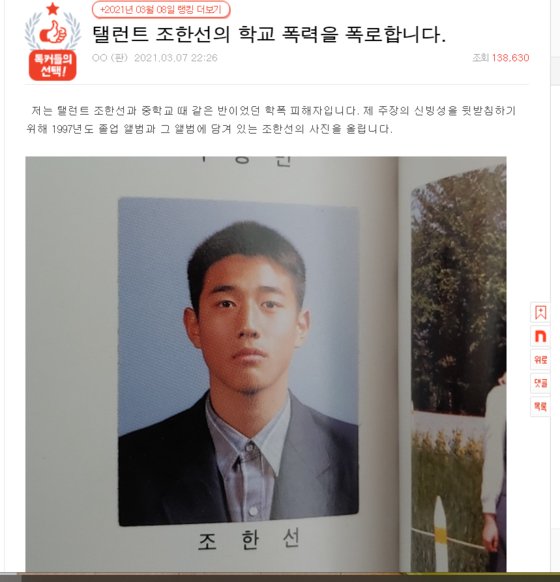 10. [+48, -7] Vay be, diğer ünlülerin skandalları çıktığında fizyonomi bir bilimdir diyordum ama bütün bunlar doğruysa Cho Han Sun bayağı şok edici oldu ㅡㅡ çok nazik bir tipi var ve çok utanmaz görünüyor. Birkaç sınıf arkadaşı o yakışıklı ve popüler bir arkadaştı, iyi futbol oynuyordu, iljin olamayacak kadar korkaktı yazmışlar ㅡ.ㅡ gerçek nedir acaba. Merak ediyorum. Yalan söyleyen kim?