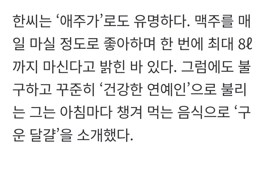“Han Hanım, aynı zamanda ‘aşırı içici’ olarak da tanınıyor. Birayı öylesine çok seviyormuş ki, her gün içiyormuş ve bir oturuşta 8 litreye kadar içebileceğini açıklamış. Buna rağmen, sürekli olarak ‘sağlıklı ünlü’ olarak anılıyor. Her sabah mutlaka yediği yiyecek olarak ‘haşlanmış yumurtayı’ tanıttı.”