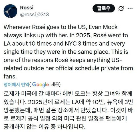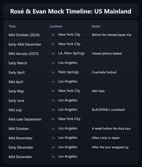 “Rosé ne zaman ABD’ye gitse, Evan Mock her zaman onunla buluşur. 2025 yılında Rosé, Los Angeles’a yaklaşık 10 kez, New York’a ise 3 kez gitti ve her seferinde aynı yerde buluştular. İşte Rosé’nin ABD ile ilgili her şeyi resmi programının dışında hayranlardan gizli tutmasının sebeplerinden biri”