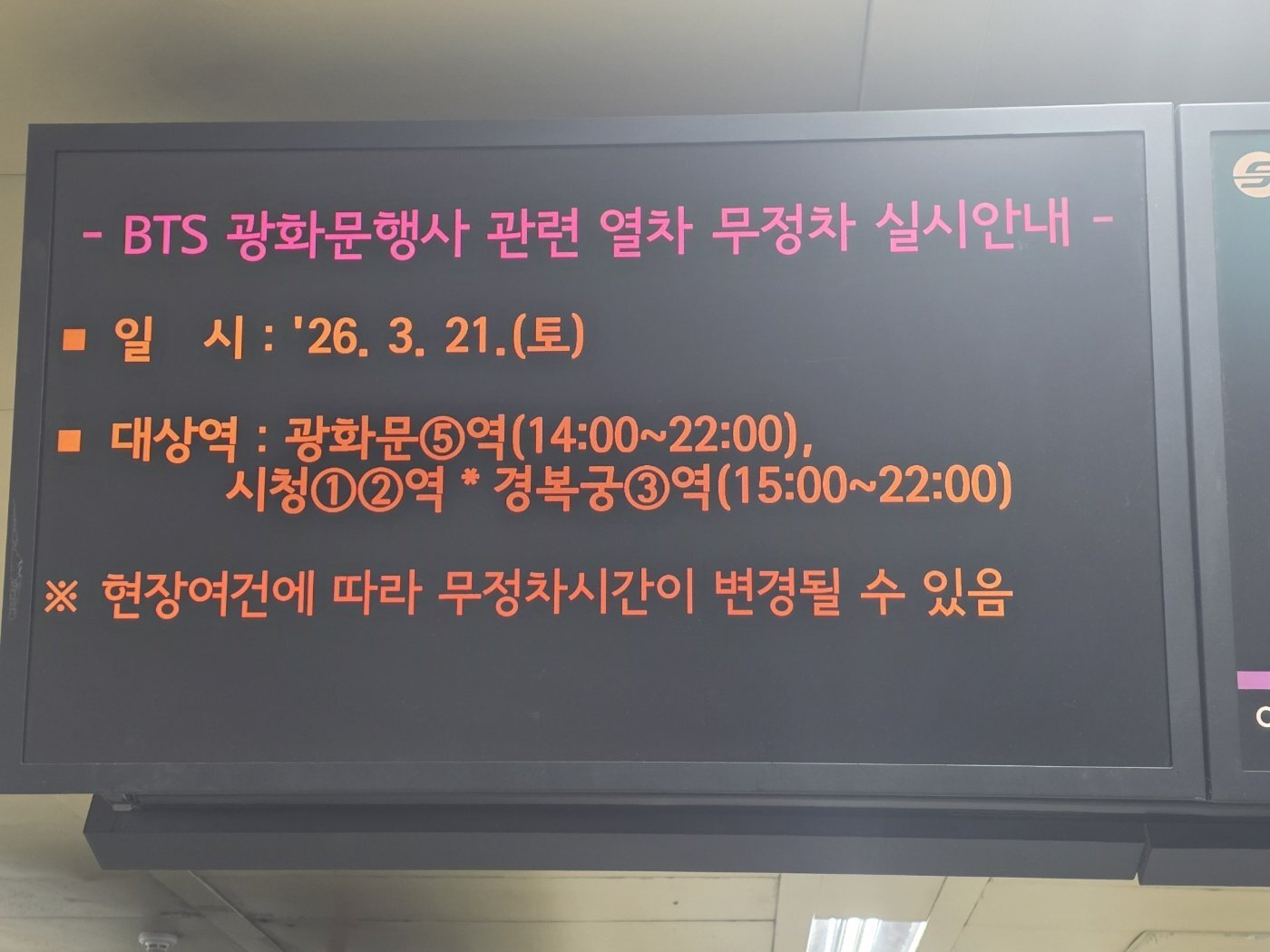 Etkilenen İstasyonlar: Gwanghwamun İstasyonu hat 5 (14:00~22:00), Belediye Binası İstasyonu hat 1,2 * Gyeongbokgung İstasyonu hat 3 (15:00~22:00)