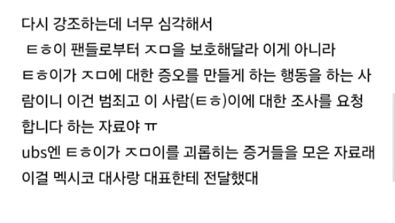 Tekrar vurgulamak istiyorum, bu çok ciddi bir durum. Bu, Jimin’i Taehyun’un hayranlarından korumakla ilgili değil. Bu, Taehyung’un JM’ye karşı nefret yaratmasıyla ilgili, yani bu bir su ve Taehyung hakkında soruşturma açılmasını talep ediyoruz. ㅠ
