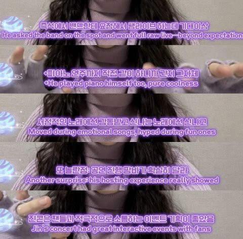 5. [+93, -13] Aespa’nın konserine ilişkin yorumuyla viral olan aynı muggle, Jin’in konserine hayran kaldığını ve onun inanılmaz bir şarkıcı olduğunu söyledi. Performansına ekleyecek bir şey yok, ama şarkı söylemesi o kadar etkileyiciymiş ki, Jin’in dünyadaki en havalı kişi olduğunu düşünmüş. Youtube videosunu kendiniz izleyebilirsiniz, o kadar duygusal şarkı söylemiş ki kız ağlamış