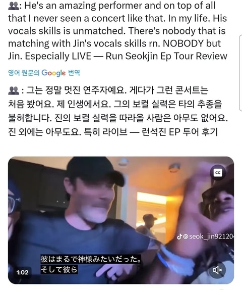 4. [+134, -33] K-pop şarkıcılarıyla çalışan bir band gitaristi, Jin’in yurt dışı solo turnesinde onunla birlikte sahne almış, sadece Jin için uzun bir mesaj bırakmış ♡ Diyor ki Jin sadece gerçek bir sanatçı değil, aynı zamanda gerçekten iyi bir insan ve onunla tekrar sahneyi paylaşmayı çok istiyor