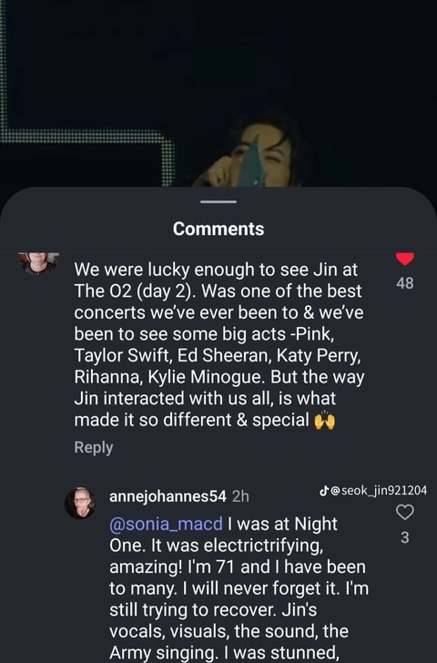 2. [+57, -3] Sadece solo konser değil, aynı zamanda dünya turu da yapabilecek kapasitede. Yeteneği olmasaydı, 30 bin kişilik bir salonu nasıl doldurabilirdi? Üstelik özellikle yurt dışındaki normal dinleyicilerden bile bir sürü fancam paylaşıldı. Kötü olsaydı çoktan eleştiri yağardı ama Jin, yurt dışındaki hayranlarından bile harika yorumlar aldı. Onu popüler uluslararası şarkıcılarla karşılaştırırsanız, konserinin en iyisi olduğunu söyleyen birçok kişi var. İnsanlar konserin eğlenceli ve inanılmaz olduğunu söylediler