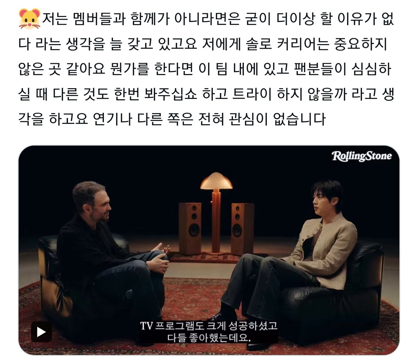 Jin: “Her zaman şunu düşündüm; eğer üyelerimle birlikte olmayacaksa, devam etmem için gerçek bir sebep yok. Solo kariyer bana önemli hissettiren bir şey değil. Eğer bir şeyler denersem, bu yine grup içinde kalır; hayranların canı sıkıldığında göz atabileceği bir şey gibi olur. Oyunculukla ya da bunun dışındaki herhangi bir şeyle hiç ilgilenmiyorum.”
