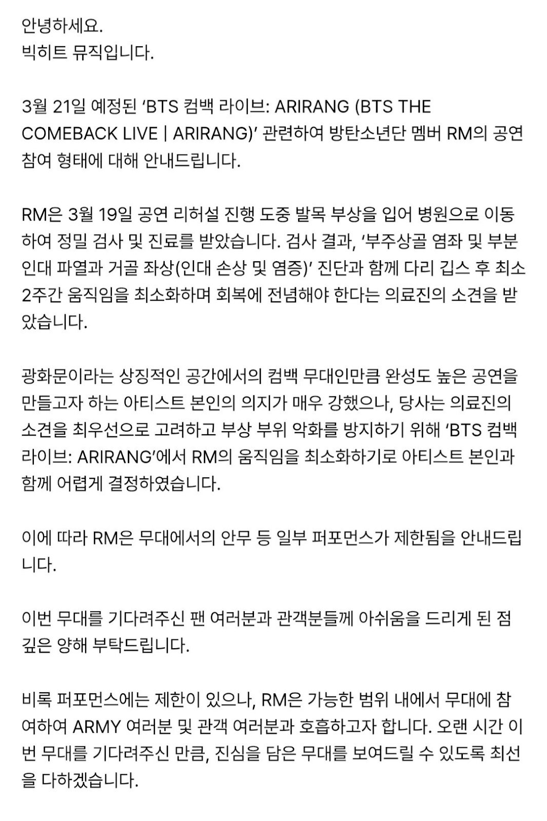 21 Mart’ta gerçekleştirilmesi planlanan “BTS THE COMEBACK LIVE | ARIRANG” etkinliğine BTS üyesi RM’nin katılımına ilişkin bir güncelleme paylaşmak istiyoruz.