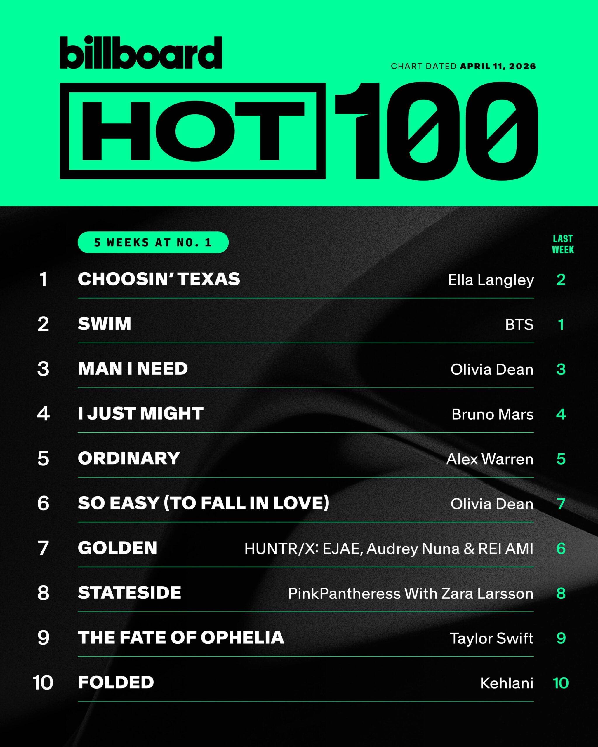 This week's top 10 on the #Hot100 (chart dated April 11, 2026).