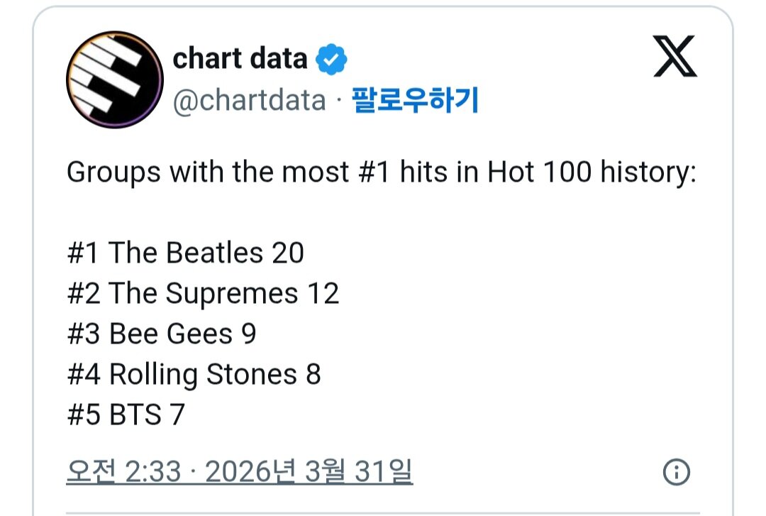 BTS joins The Rolling Stones and The Beatles as the only groups in history to score at least 7 #1 singles and albums in the US. pic.twitter.com/5tn1MZeLKB