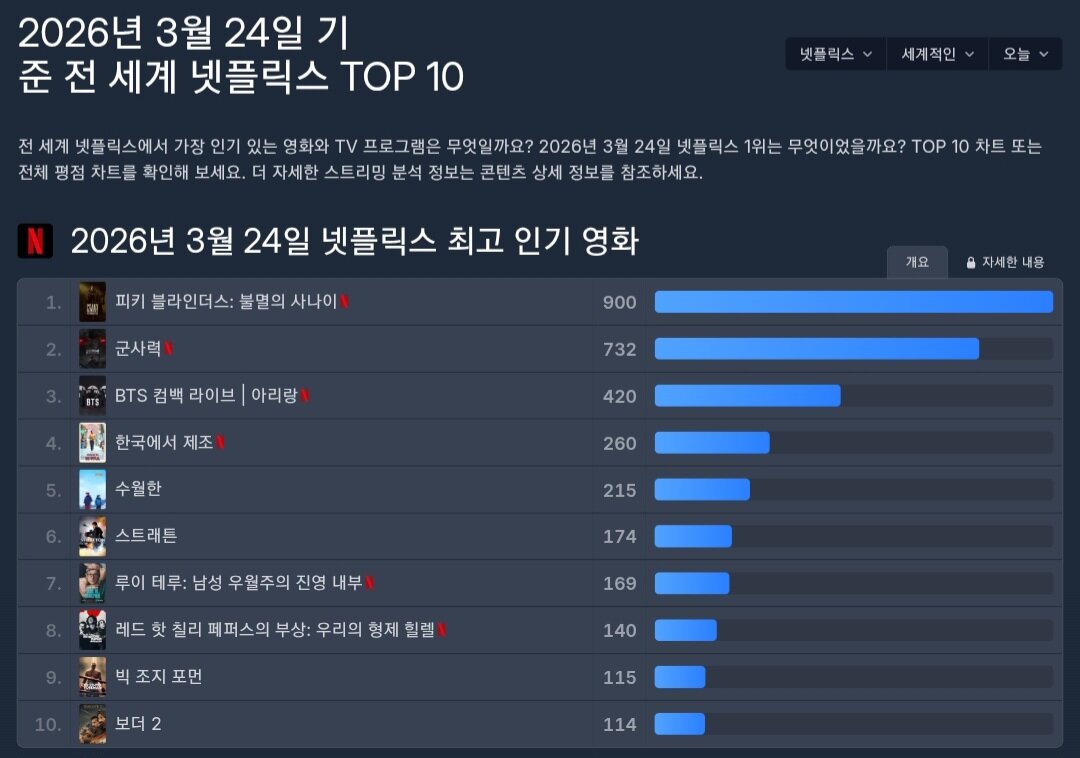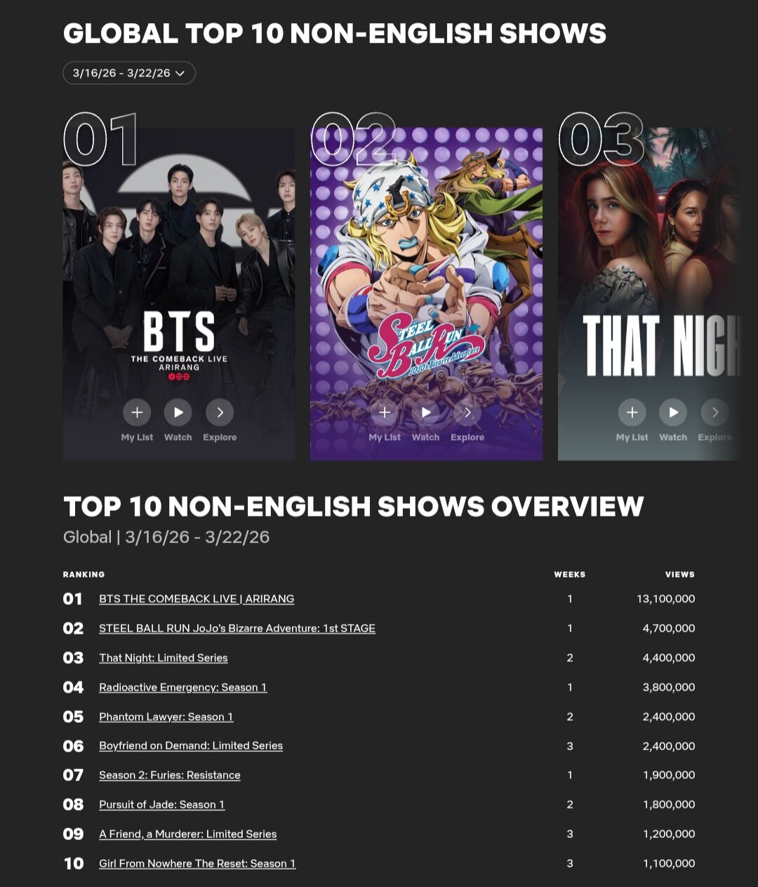 Kore’de yayınlanan ilk Netflix canlı etkinliği olan ‘BTS Comeback Live: ARIRANG’, 80 ülkede haftalık Top 10’a girme ve 24 ülkede 1 numara olma gibi dikkate değer bir başarıya imza atarak, BTS ve K-pop’a olan küresel ilgiyi bir kez daha kanıtladı.