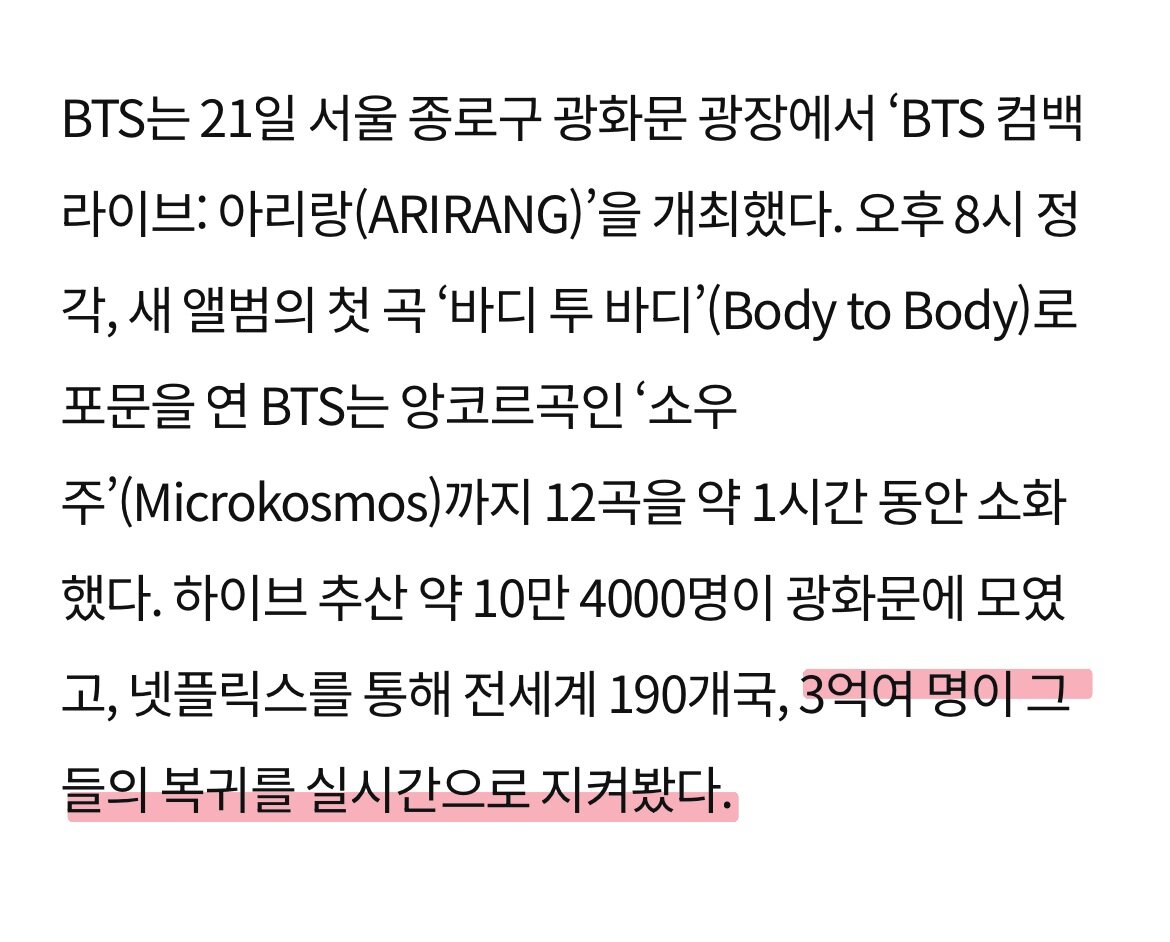 “Gwanghwamun’da yaklaşık 104.000 kişi toplandı, dünya çapında 190 ülkeden 300 milyondan fazla kişi ise Netflix üzerinden dönüşlerini gerçek zamanlı olarak izledi.”