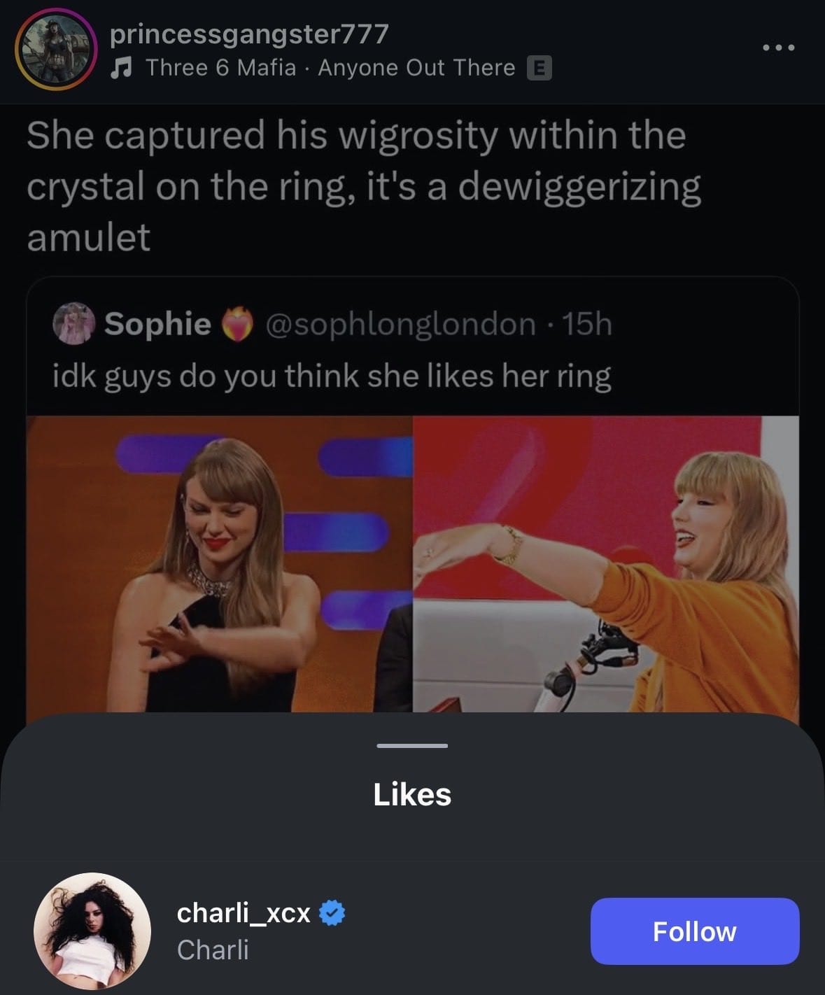 5. Charli, Taylor’ı görmezden geliyor gibi görünen bir fotoğraf çekimi yaparken bile Taylor, dergi röportajında Charli’ye selam göndermiştiㅋㅋㅋㅋㅋㅋ Onun aşağılık kompleksi çılgınca