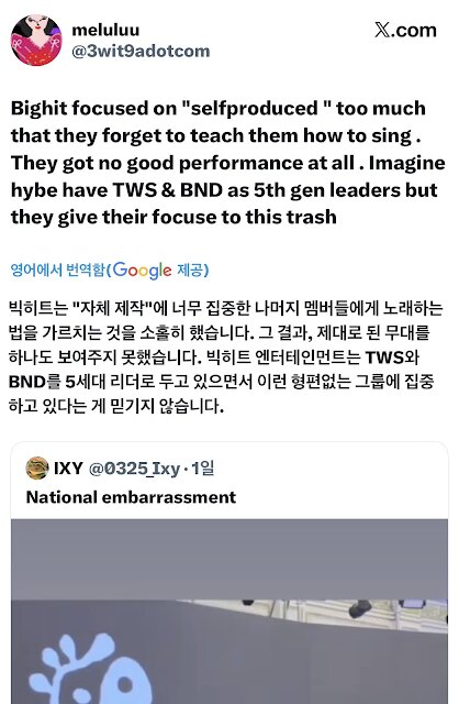 “Bighit “kendi şarkılarını yapan grup” kısmına o kadar odaklandı ki onlara şarkı söylemeyi öğretmeyi unuttu. Performansları hiç iyi değil. Ellerinde 5. jen liderleri olarak TWS ve BND var ama dikkatlerini bu çöp gruba yöneltmeyi seçiyorlar”