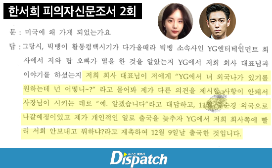 Dispatch’in haberine göre YG, Han Seohee ve TOP’nin birlikte uyuşturucu kullandığını öğrendikten sonra Big Bang albüm promosyonları sırasında ayak altında olmaması için Han Seohee’yi LA’e yollamış. Dispatch TOP ve Han Seohee arasındaki mesajları ve Han Seohee’nin şirketinden bir personelin tanıklığını açıkladı.