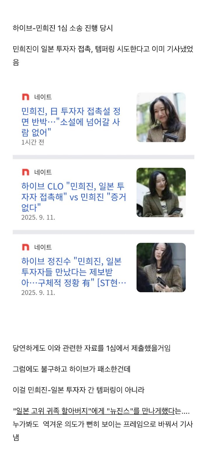 HYBE-Min Heejin davasının ilk duruşması sırasında, Min Heejin’in Japon yatırımcılarla temas kurduğu ve şirkette manipülasyona kalkıştığına dair haberler çıkmıştı