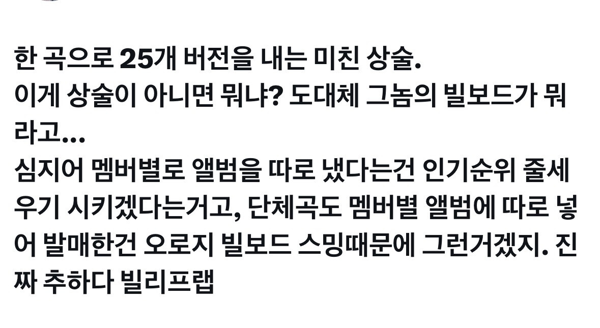 Her üye için ayrı albüm çıkarmak resmen popülerlik sıralamasını zorlamaktan başka bir şey değil ve grup şarkılarını bireysel üye albümlerine koymak tamamen Billboard stream’i için. Gerçekten çok acınası bir durum, Belift Lab.”