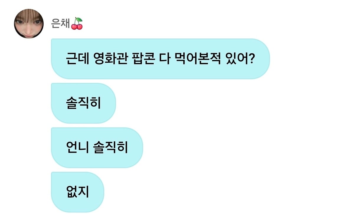 – Ama sinemada patlamış mısırın hepsini gerçekten bitiren var mı? Dürüst ol. Unnie, dürüst ol. Sen de bitirmedin değil mi?