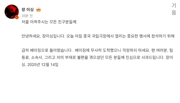 Zhang Yixing, 14 Aralık 2025”