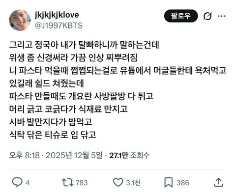 Ve Jungkook… fandomdan ayrılmış biri olarak artık bunu söyleyebilirim: lütfen hijyenine dikkat et. Bazen izlemek gerçekten rahatsız edici oluyorsun. YouTube’da insanlar makarna yerken dudak şapırdatmanı eleştiriyordu, ben de seni savunuyordum. Ama makarna yaparken yumurtalı şeyler her yere sıçrıyor, sonra başını ve burnunu kaşıyıp gidip malzemelere dokunuyorsun, ve ayaklarına dokunup sonra yemek yiyorsun, masayı silmek için kullandığın peçeteyle ağzını siliyorsun.