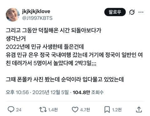 Ve hayran olduğum yıllara dönüp baktığımda aklıma bir şey geldi. 2022’de bir Mingyu sasaeng’inden şunu duymuştum: Yugyeom, Mingyu, Eunwoo ve Jungkook yurt içinde bir tatile gitmiş ve Jungkook da ünlü olmayan kız arkadaşını götürmüş, beşi birlikte 3 gün 2 gece vakit geçirmişler… O zaman gizlice çekilmiş bir telefon fotoğrafını da görmüştüm ama ben sadık bir hayran olduğum için ağzımı açmamıştım.