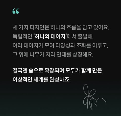 Üç tasarım tek bir akışı temsil ediyor. Bağımsız bir “papatya” ile başlayan tasarımda, birden fazla papatya bir araya gelerek çeşitlilik ve uyumu yaratıyor, bunların üzerinde dayanışmayı simgeleyen bir ağaç büyüyor. Sonunda ise bir ormana dönüşüyor ve hepimizin birlikte yarattığı ideal dünyayı tamamlıyor.