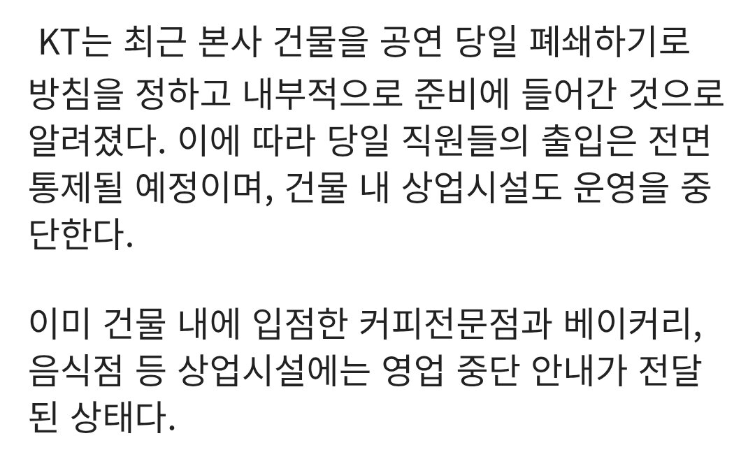 “KT’nin, konser günü merkez binasını kapatma kararı aldığı ve bu doğrultuda şirket içinde hazırlıklara başladığı bildiriliyor. Buna göre, çalışanların o gün binaya girişi tamamen yasaklanacak ve bina içindeki ticari işletmeler de faaliyetlerini durduracak.