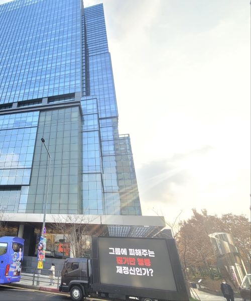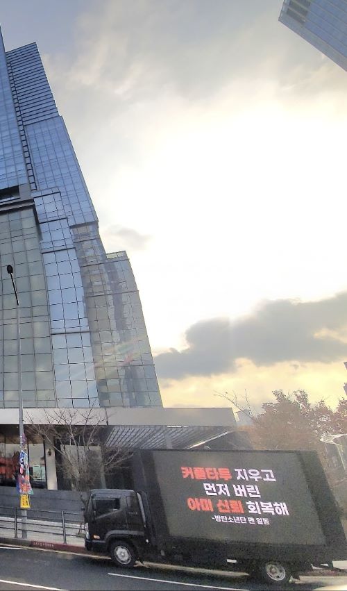 HYBE önünde şirketi ve Jungkook’u protesto eden kamyonlar görüldü