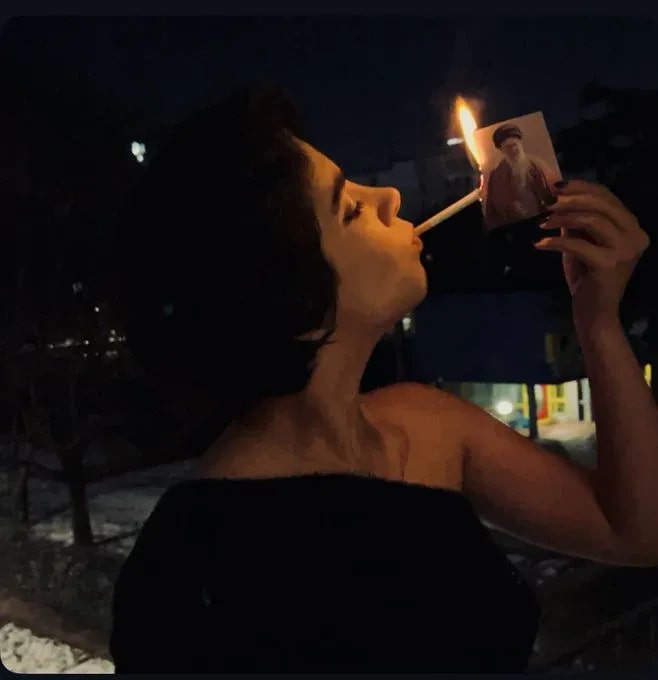 Başörtüsünü çıkarıp, Khamenei’nin fotoğrafı önünde sigara yakıyor