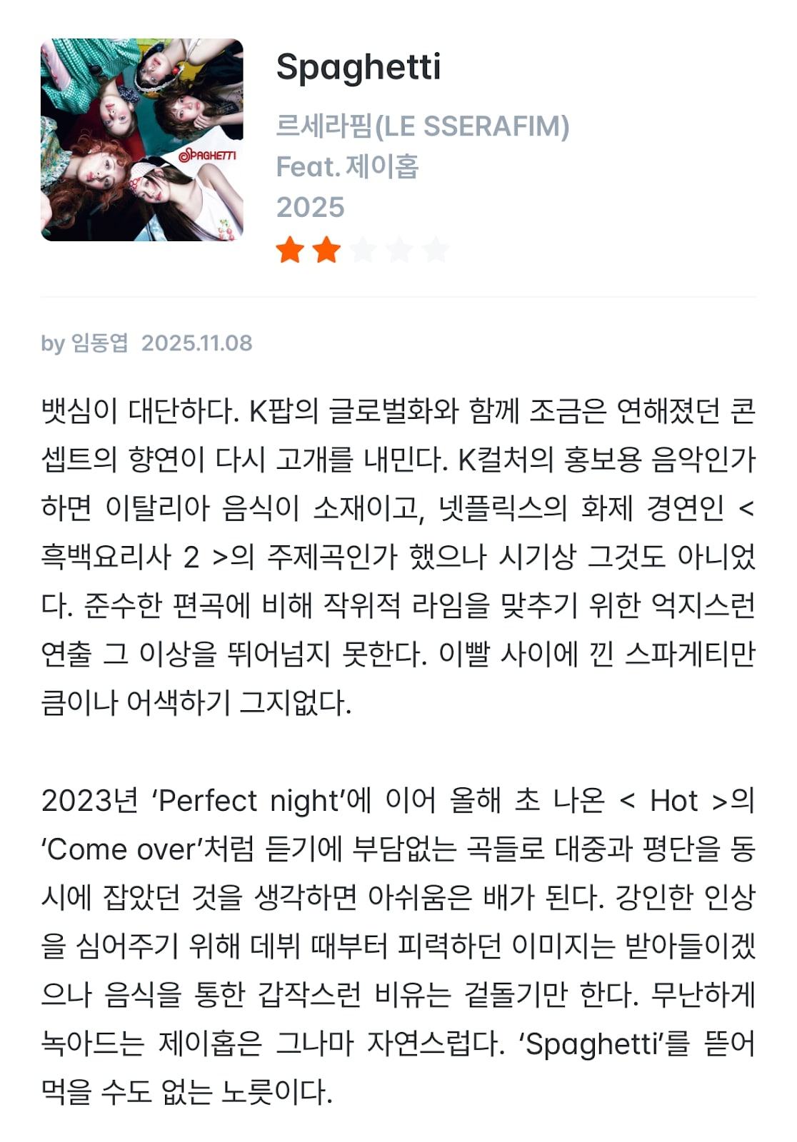 Bu yılın başlarında, hem dinleyicileri hem de eleştirmenleri kolay dinlenebilirliğiyle cezbeden Perfect Night (2023) ve Come Over gibi şarkıları düşününce, buradaki hayal kırıklığı daha da büyük hissediliyor. Çıkışlarından beri yarattıkları güçlü imaj anlaşılabilir, ama bu ani yiyecek temalı metafor tamamen yersiz hissettiriyor. En azından J-Hope’un varlığı doğal bir şekilde uyum sağlıyor. Yine de “Spaghetti”yi tam olarak çiğneyemezsiniz.