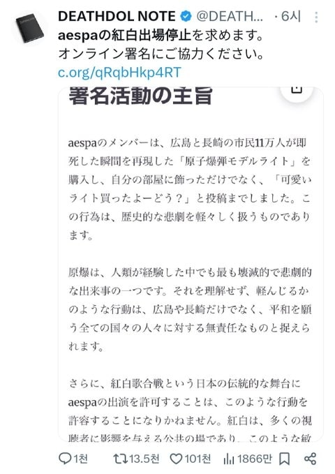 Kouhaku’da performans sergilemelerini yasaklamak için başlatılan imza kampanyası, gerçek zamanlı trendlere girdi. Tweet 10 binden fazla retweet ve 100 binden fazla beğeni aldı. Gerçekten patladı…