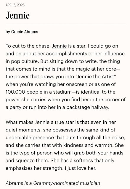 TIME DERGİSİ: JENNIE, 2026 YILININ EN ETKİLİ 100 KİŞİSİNDEN BİRİ SEÇİLDİ