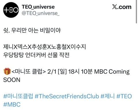 “The Secret Friends Club”, katılımcıların kimliklerini açıklamadan birine özel bir hediye hazırladığı bir realite varyete programı. İlk kadroda BLACKPINK’ten Jennie, Dex, Choo Sung Hoon, Noh Hong Chul ve Lee Soo Ji bulunuyor.