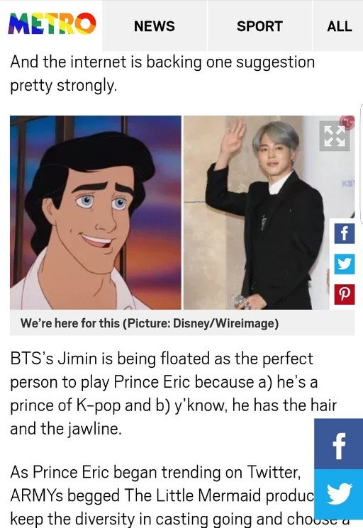 Bu 2016 yılında BLOOD SWEAT AND TEARS basın konferansında başladı. Jimin’in silüeti takım elbisesi ve saçı sebebiyle Prens Eric’e benziyordu ve ondan sonra Army ona Prens Eric demeye başladı. Sonra herkes filmden bahsetti, army’ler de Jimin’in role tam uyacağını konuşmaya başladı. Sonra medya nasıl olduysa bunu öğrendi ve viral oldu. Ciddi bir şey yok, Jimin oyuncu değil, İngilizce bilmiyor ve vakti yok çünkü tüm yıl konser turunda sfdsfsd