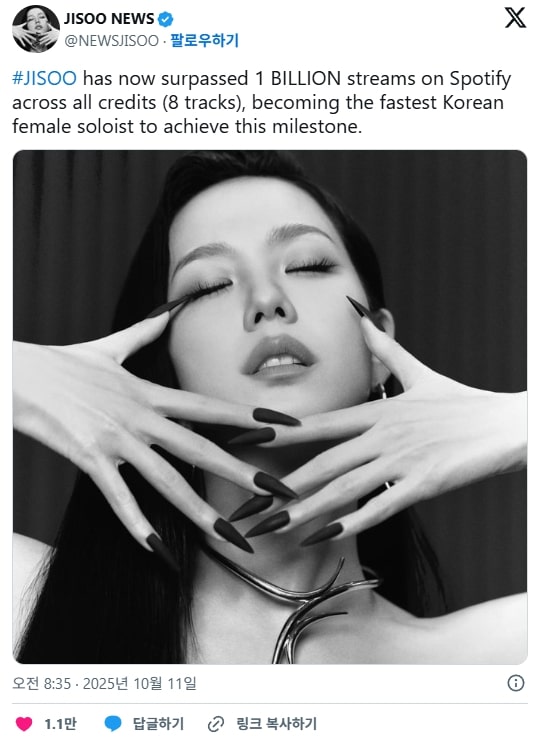 JISOO, SPOTIFY’DA 1 MİLYAR DİNLEMEYE ULAŞTI, BU BAŞARIYI ELDE EDEN İLK KORELİ KADIN SOLO SANATÇI OLDU