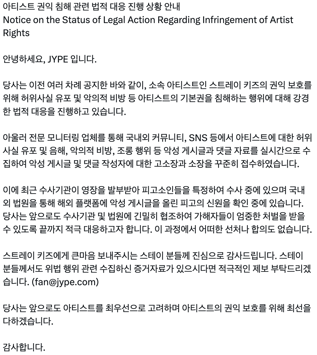 Daha önce birçok kez duyurduğumuz üzere, şirketimiz sanatçımız Stray Kids’in temel haklarını ihlal eden eylemlere—özellikle yanlış bilgi yayılması ve kötü niyetli iftiraya—karşı hak ve çıkarlarını korumak amacıyla kararlı yasal önlemler almaktadır.
