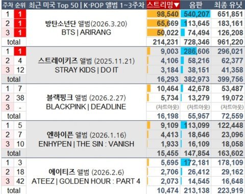BTS ile BLACKPINK arasında devasa bir uçurum var; aynı zamanda BLACKPINK ile TWICE/Stray Kids arasında da bariz bir fark mevcut.