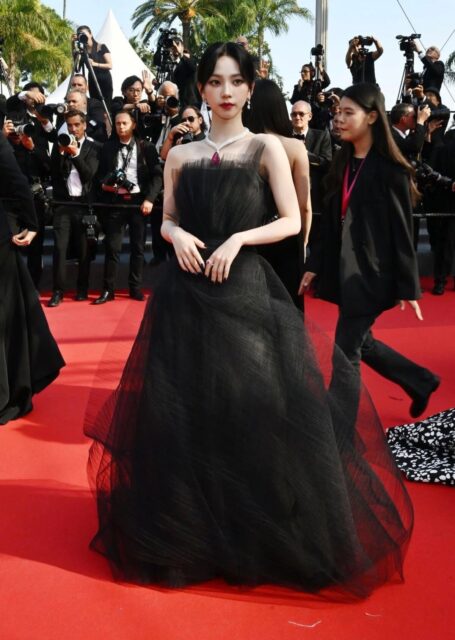 Karina, bu kolyeyi siyah bir elbiseyle kombinledi. Uyumlu takılar ve daha dramatik bir makyajla görünümünü tamamladı.