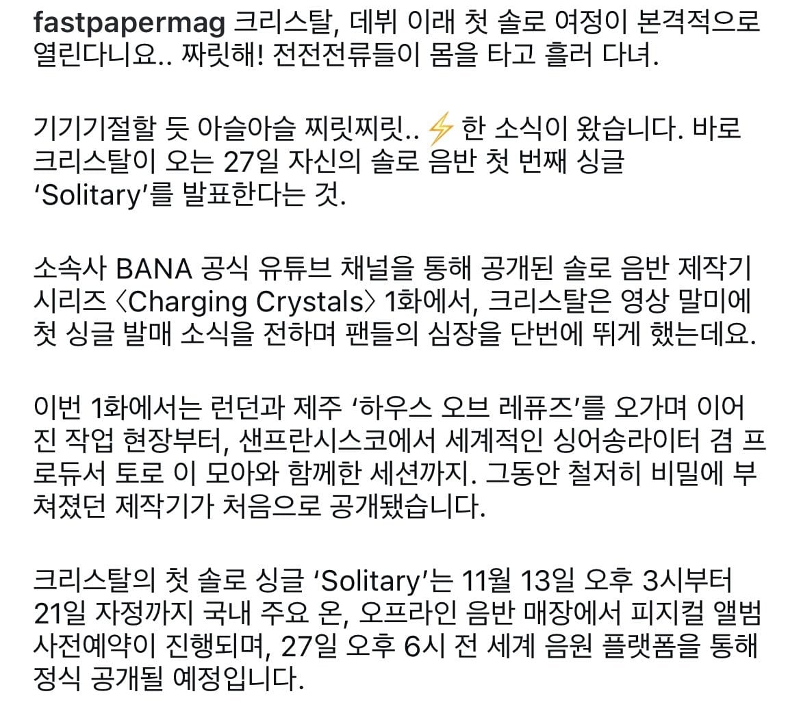 Krystal’ın ilk solo single’ı “Solitary”, 13 Kasım saat 15:00’ten 21 Kasım gece yarısına kadar, yurt içindeki büyük çevrimiçi ve çevrimdışı müzik mağazalarında fiziksel albüm olarak ön siparişe açılacak. 27 Kasım saat 18:00’de ise dünya çapında müzik platformlarında resmi olarak yayınlanacak.”