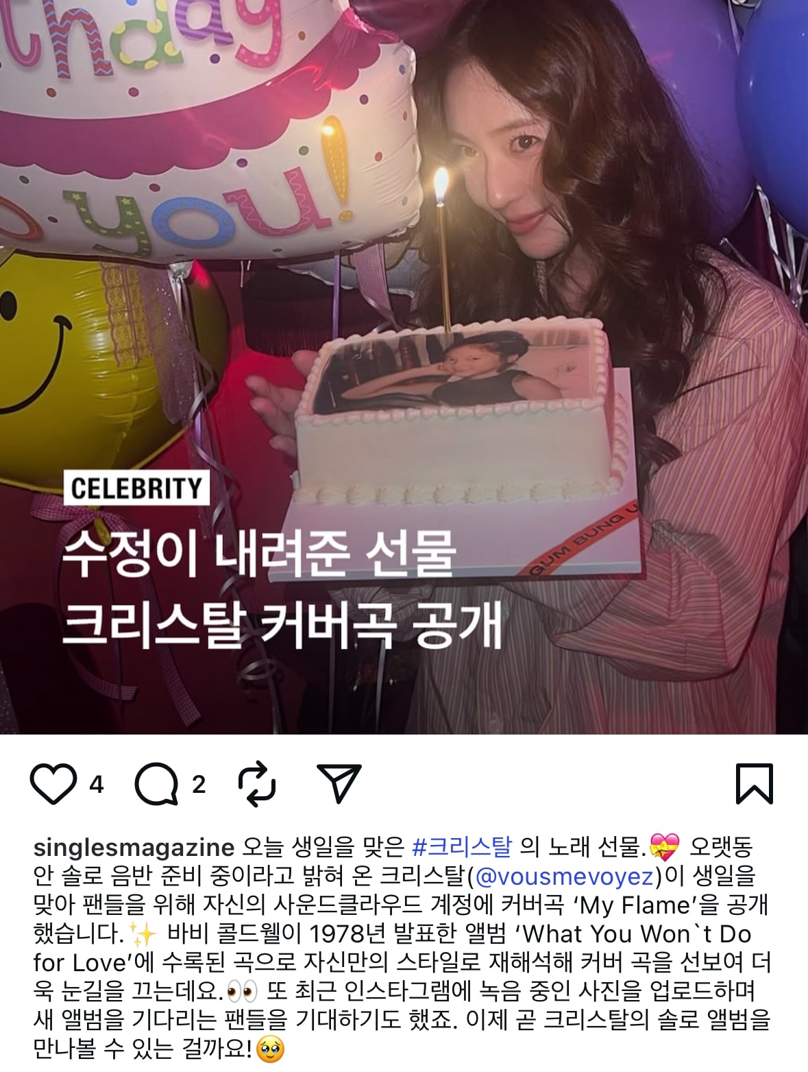 “Şarkıcı ve aktris Krystal, doğum günü için SoundCloud’da bir cover şarkı yayınlayarak hayranlarını şaşırttı. Bu parça, Amerikan soul efsanesi Bobby Caldwell’in imza şarkısı ”My Flame“in, Krystal’in kendine özgü büyüleyici duygularıyla harmanlanmış bir yorumu. Yaklaşan geri dönüşü için, yorumlarda doğum günü dileklerinizi ve destek mesajlarınızı iletin!”