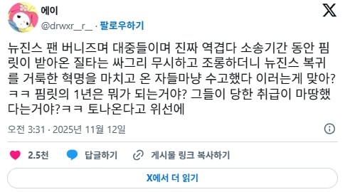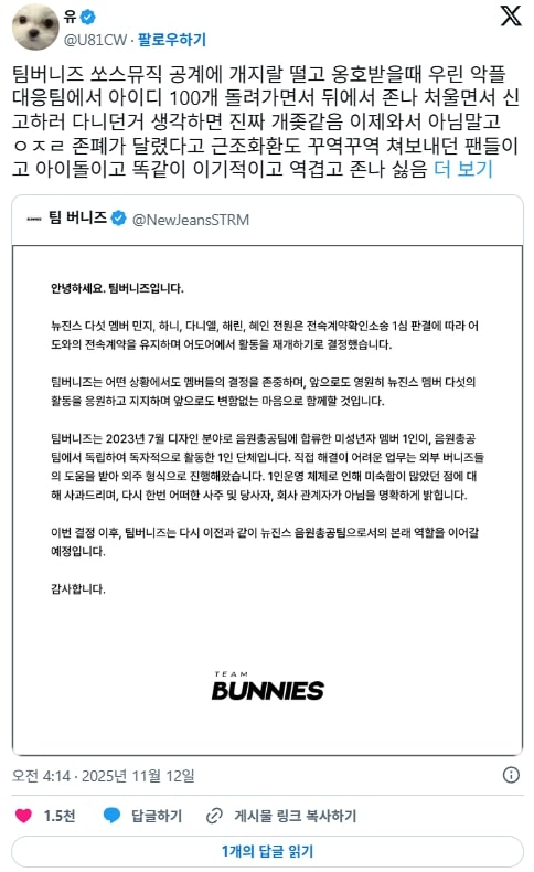 NewJeans fanları Bunnies ve kamuoyu gerçekten mide bulandırıcı. Dava süresince FIM-LIT’e yöneltilen tüm eleştirileri tamamen görmezden gelip dalga geçtiler, şimdi de NewJeans’in geri dönüşü sanki kutsal bir devrimmiş gibi davranıyorlar ve “aferin” diyorlar, bu mu doğru ㅋㅋ Peki FAM-LIT’in tüm yıl boyunca yaşadıkları ne olacak? Bu, onlara yapılan muamelenin haklı olduğu anlamına mı geliyor? ㅋㅋ İkiyüzlü hareketlerinize kusasım geliyor