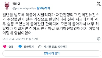 Bir yılı aşkın süredir nefret yorumlarına maruz kaldık, dava da uzadıkça uzadı, sonunda Min Heejin ve NewJeans’in iddia ettiği her şeyin yalan olduğu ortaya çıktı, artık biraz nefes alabiliyorum derken o tek kelime, “bitti” kelimesi, her şeyi yeniden altüst etti, tükendim resmen. Madem böyle olacaktı, en azından insanlığınızı kaybetmeseydiniz… nasıl bu kadar vicdansız olabiliyorsunuz?