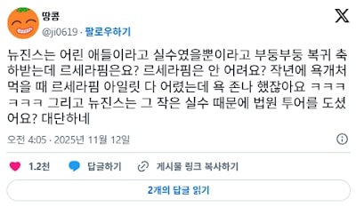 NewJeans daha çocuk sayılır, bu yüzden dönüşleri kutlanıyor, her şey övülüyor ve “sadece bir hataydı” deniyor; peki ya LE SSERAFIM? LE SSERAFIM de genç değil mi? Geçen yıl tüm o saçmalıklar onlara yöneltildiğinde, LE SSERAFIM ve ILLIT de gençti, ama fena halde sövüldüler, değil mi? ㅋㅋㅋㅋㅋ Ve NewJeans o minicik hata yüzünden mahkeme turuna mı çıktı? Helal olsun be