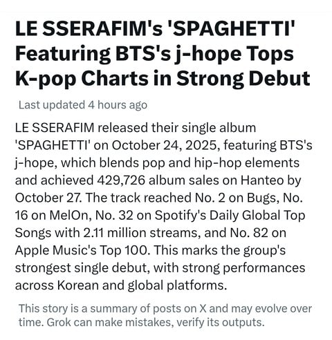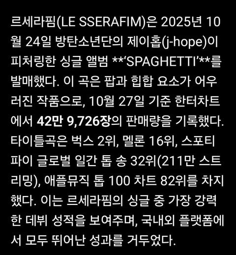 LE SSERAFIM, 24 Ekim 2025’te BTS j-hope’un yer aldığı single albümü “SPAGHETTI”yi çıkardı. Pop ve hip-hop unsurlarını harmanlayan bu şarkı, 27 Ekim itibarıyla Hanteo Chart’ta 429.726 kopya satış rakamına ulaştı. Albümün başlık şarkısı Bugs’ta 2., Melon’da 16., Spotify’ın Global Daily Top Songs listesinde 32. (2,11 milyon dinlenme) ve Apple Music’in Top 100 listesinde 82. sırada yer aldı. Bu, LE SSERAFIM’in single’ları arasında en güçlü çıkış performansı olduğunu gösteriyor ve hem yurt içi hem de yurt dışı platformlarda mükemmel sonuçlar elde etti.