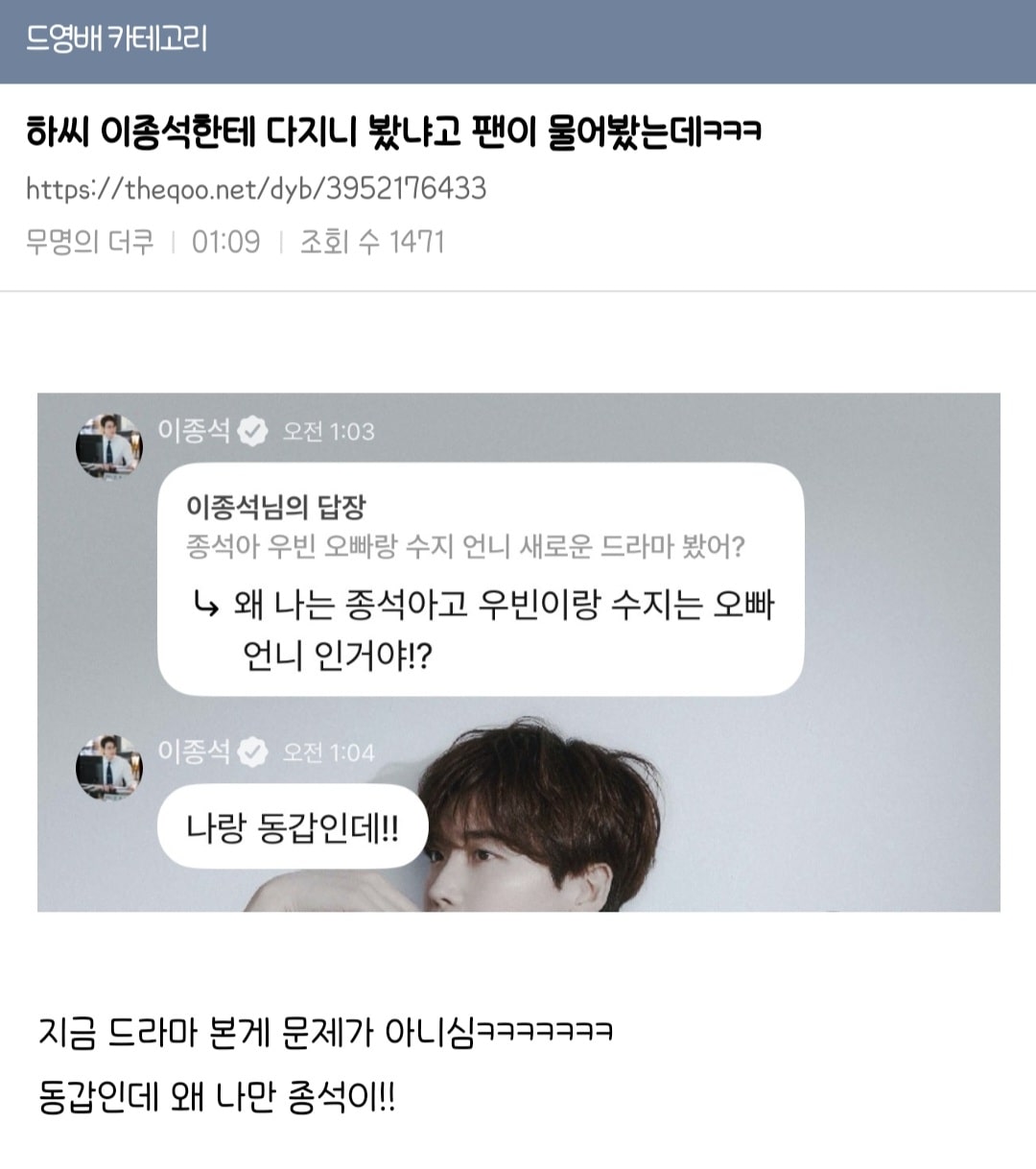 “Hayran: Jongsuk-ah, Woobin oppa ve Suzy unnie’nin oynadığı yeni diziyi izledin mi?