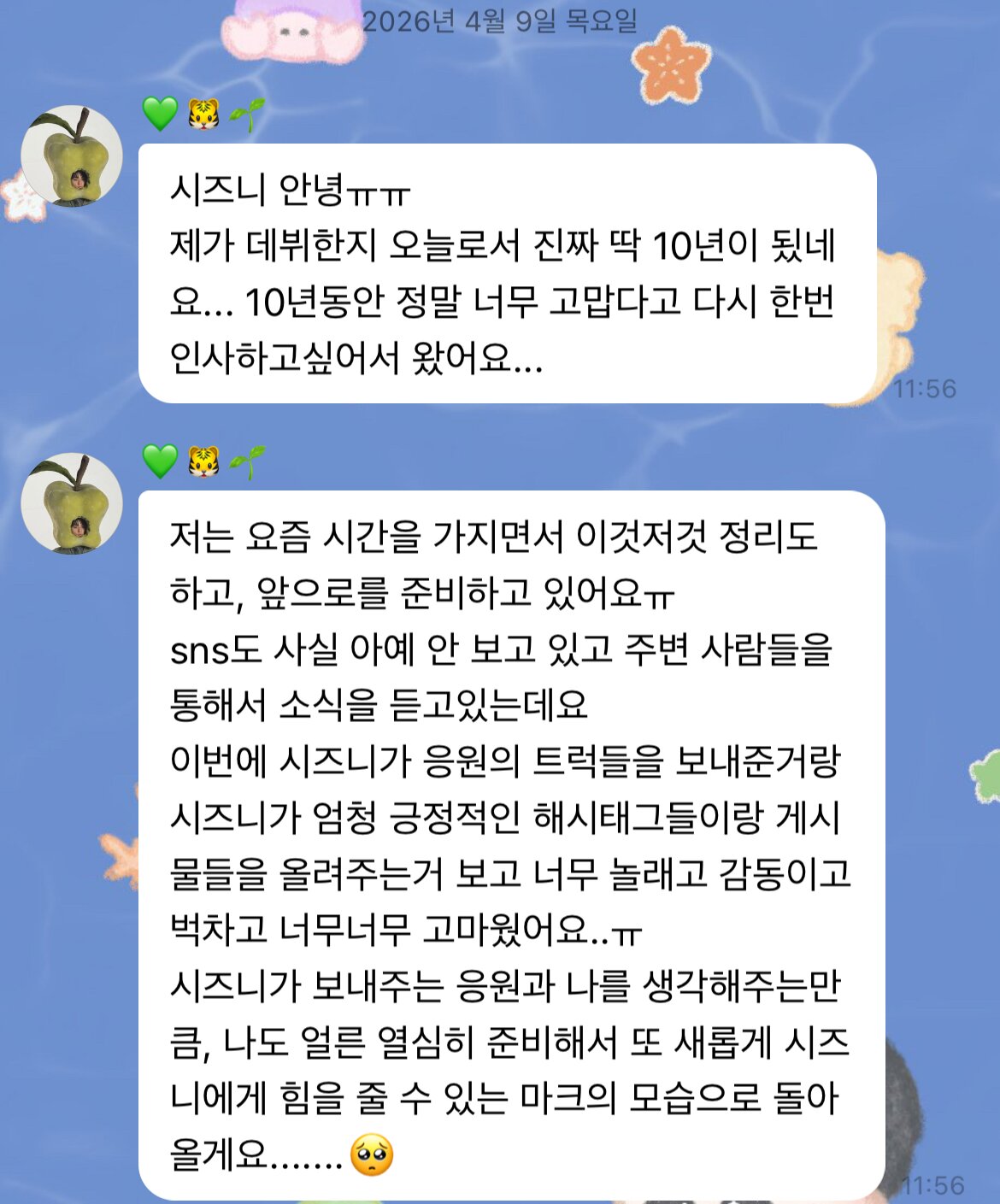 Bir kez daha, benim yüzümden incinen ve duyguları zedelenen tüm Czennie’lerden ve herkesten çok özür dilerim.. Ve her şeyden önemlisi, gerçekten çok minnettarım; bir dahaki sefere tekrar geleceğim. NCT’nin 10. yıl dönümünü bir kez daha tüm kalbimle kutluyorum….