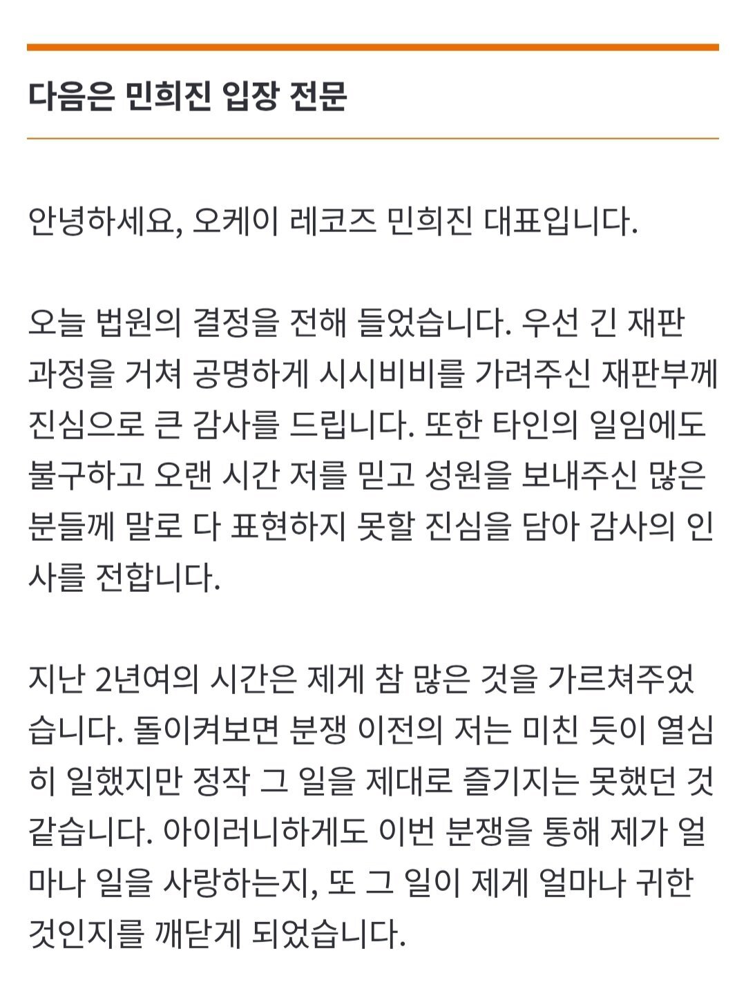 Yargının kararıyla hissedar sözleşmesinin meşruiyetinin teyit edilmesini saygıyla karşılıyorum ve bu kararın K-pop sektörünün kendi kendini arındırması ve gelişmesi için bir dönüm noktası olmasını umuyorum. Ayrıca bunun, K-pop sektöründe sözleşmelerin ve verilen sözlerin ne kadar ciddi olduğunu ve bunların gerçekten yaratıcıların konumunu yeterince temsil edip etmediğini yeniden hatırlatan bir fırsat olmasını diliyorum. Bununla birlikte, görünmeyen yerlerde çeşitli adaletsizliklerle mücadele eden herkese de başsağlığı ve destek dileklerimi iletmek istiyorum.