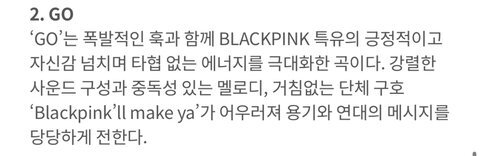 “‘GO’, BlackPink’in kendine özgü pozitif, kendinden emin ve taviz vermeyen enerjisini patlayıcı bir nakaratla en üst düzeye çıkaran bir şarkı. Güçlü bir ses kompozisyonu ve bağımlılık yaratan bir melodiye sahip olan şarkı, durmak bilmeyen grup sloganı ‘Blackpink’ll make ya’ ile birleşerek cesaret ve dayanışma mesajını gururla iletiyor.”